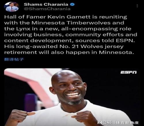 据权威体育记者Shams独家披露,加内特将以一种前所未有的身份重返森林狼,深度参与球队的商业运营、社区公益活动以及内容创新开发等多个领域,全方位助力球队发展。而更令人激动的是,森林狼队将为其标志性的21号球衣举行盛大的退役仪式,以此致敬这位传奇球星对球队的卓越贡献。