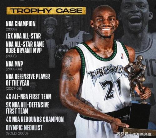 加内特的职业生涯堪称荣誉满载:他荣膺过1次NBA常规赛MVP,1次捧起奥杯(总冠军奖杯),1次当选年度最佳防守球员(DPOY),9次入选最佳阵容、12次入选最佳防守阵容,4次加冕篮板王,15次入选全明星阵容,2020年更是荣耀入选奈史密斯篮球名人堂。此外,他还曾助力美国男篮在奥运赛场上摘得金牌,书写了一段段传奇佳话。